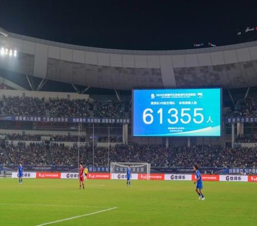 10月4日,大屏幕显示本场比赛共有61355名球迷到场观赛。 新华社记者 李博 摄