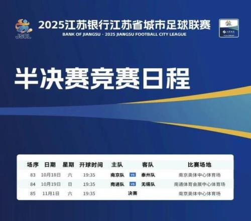 本周末,“苏超” 即将迎来半决赛。10 月 18 日,南京队交锋泰州队,“苏超” 首场半决赛将在南京奥体中心球场打响;10 月 19 日,南通队迎战无锡队,也将在南通体育会展中心体育场如约举行。究竟是南京队 “复仇” 成功,还是泰州队继续延续 “黑马” 传奇,无论结果如何,这届 “苏超” 半决赛都吊足了观众的胃口。
