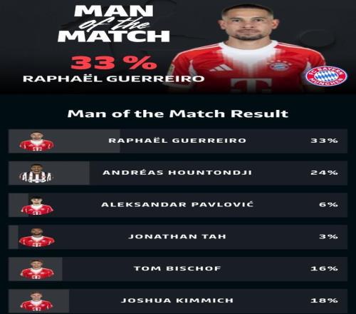 本场比赛,格雷罗首发出战,在第44分钟打入一球,帮助拜仁取得领先,赛后,他以33%的得票率当选本场比赛最佳球员。
