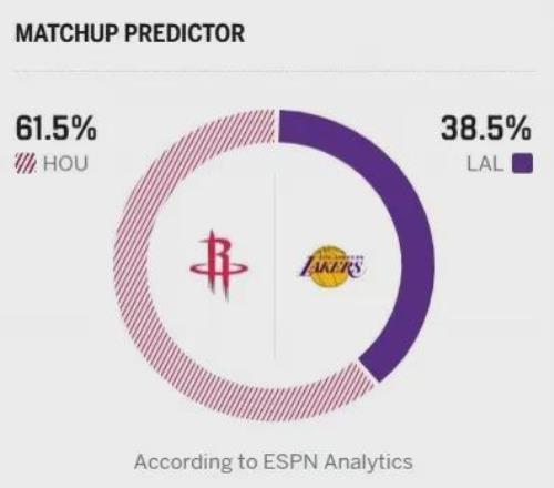 知名美媒ESPN预测,圣诞大战火箭的胜率高达61.5%,湖人只有38.5%。