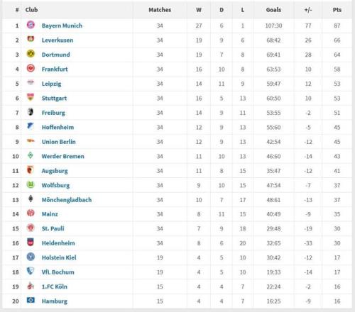 德甲2025年度积分榜:拜仁34场仅1负打进107球,领先第二21分_24直播网