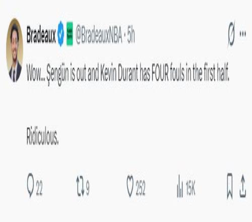 很明显火箭记者认为裁判早早给杜兰特4次犯规改变了一切,如果杜兰特能以常规轮换登场,他攻防两端的威慑力不会在第二节出现19-32崩盘的情况,杜兰特本赛季场均25.7分5篮板4.6助攻0.7抢断1盖帽,命中率52.3%,三分命中率42.3%,真的很猛。