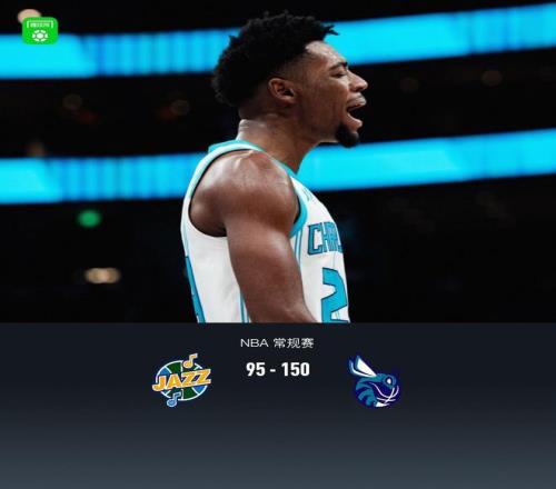 第四节爵士小克莱顿拿下11分,黄蜂特雷-曼拿下20分,最终爵士95-150不敌黄蜂