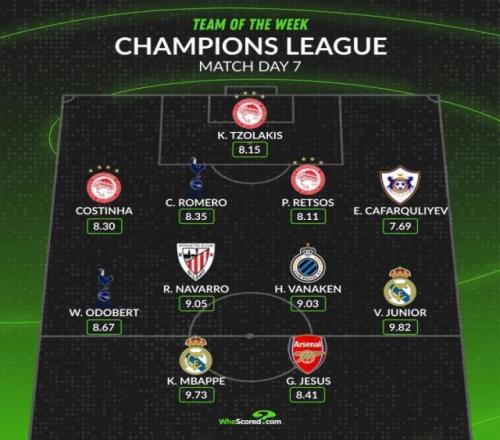 WhoScored欧冠本轮最佳阵容:姆巴佩、维尼修斯、热苏斯在列